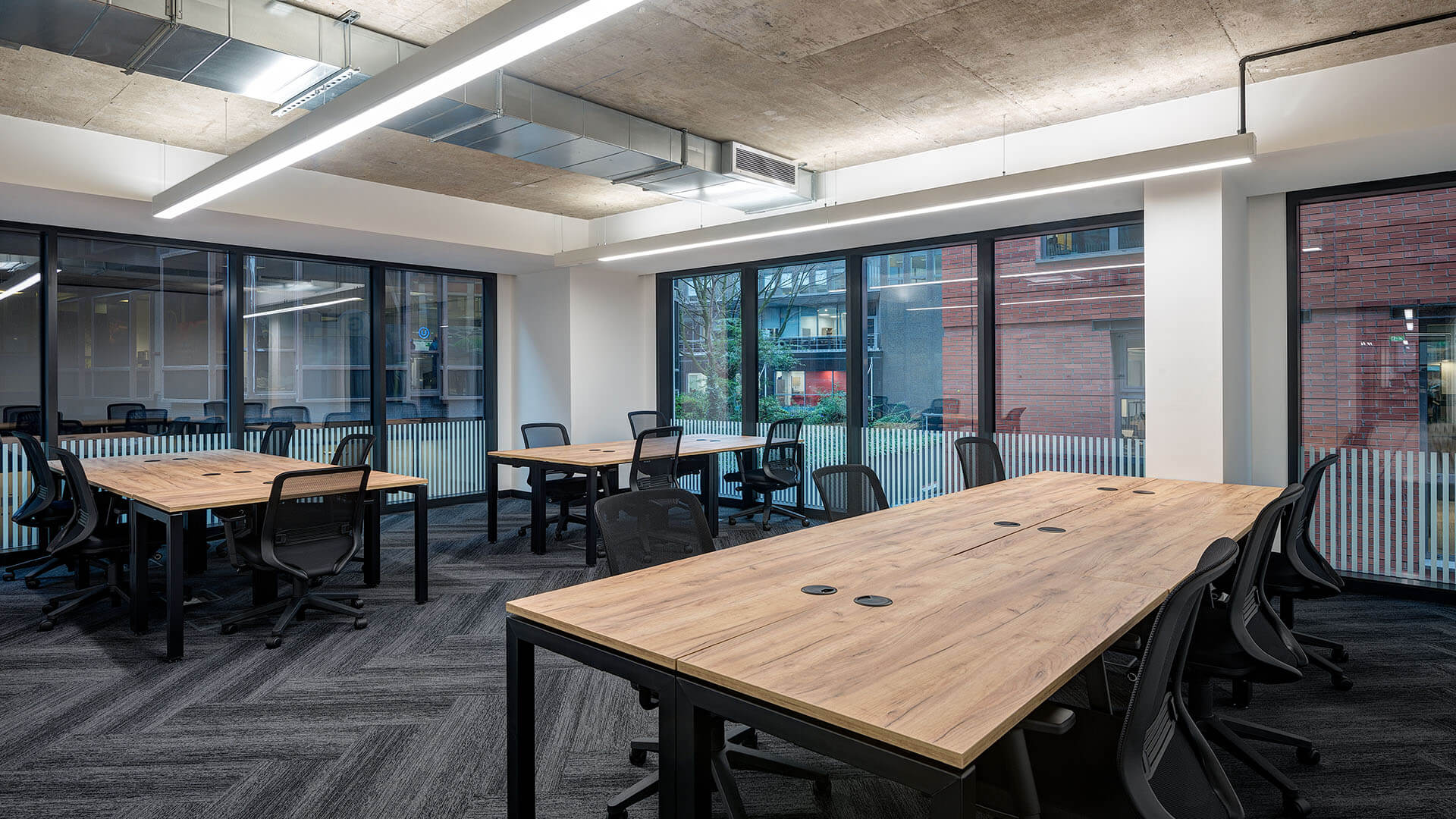 Spacious ground-floor 18-desk office with floor-to-ceiling windows that flood the space with natural light. Conveniently located near phone booths, breakout areas, and printing facilities — everything your team needs, just steps away.